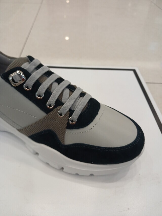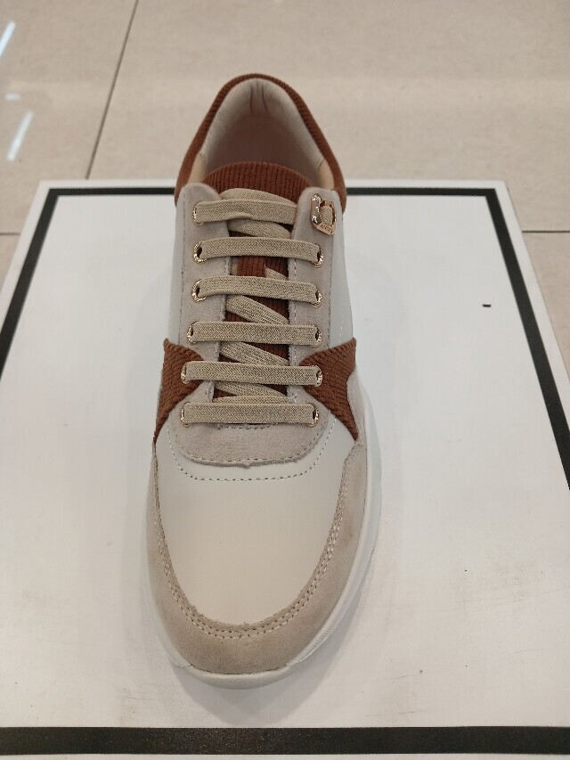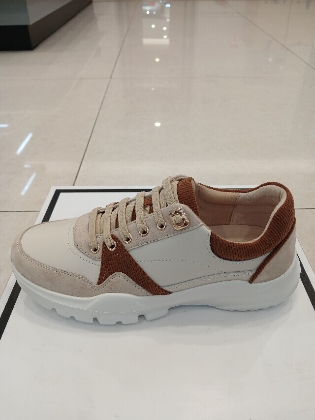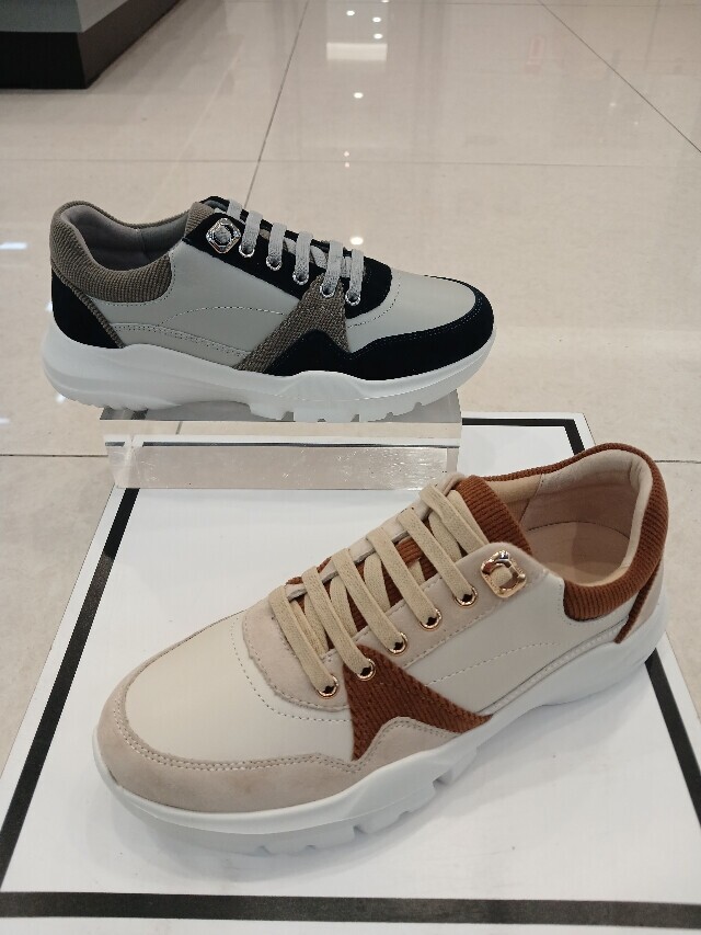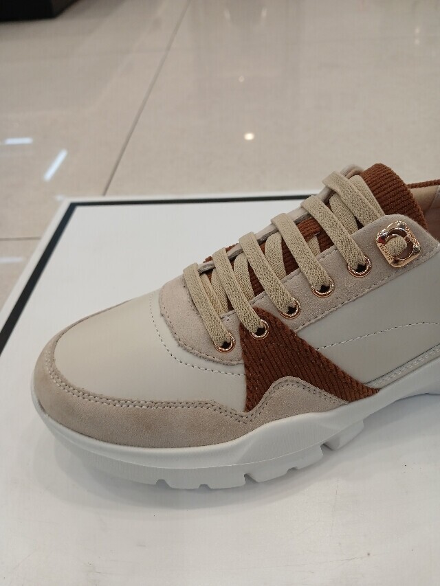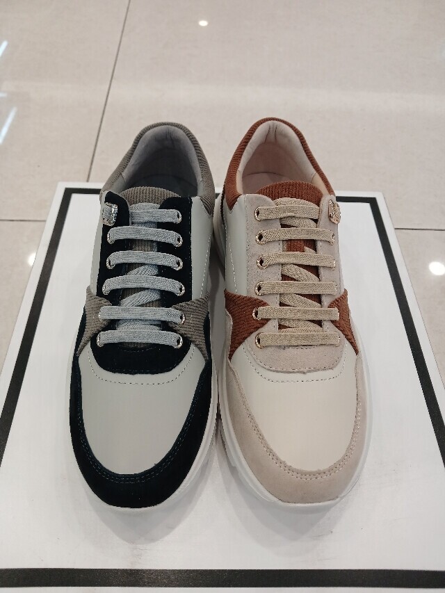 굽높이 약5cm의 높이에 천연소가죽60% 양가죽30% 패브릭10%소재를 특수공법으로 가공처리하여 제작된 여성 쿠셔닝 스니커즈입니다
