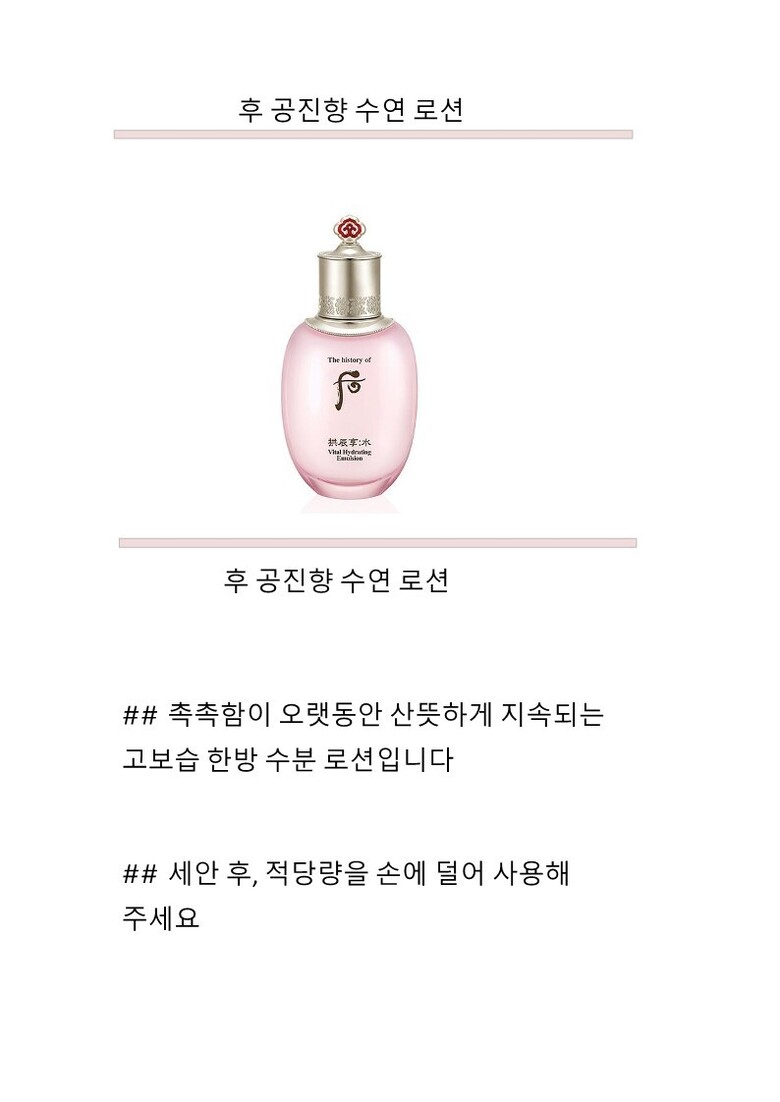 | 7. 주요성분 | 정제수, 프로판디올, 스쿠알란, 백화사설초추출물, 디메치콘, 부틸렌글라이콜, 감초추출물, 메도우폼씨오일, 글리세린, 작약추출물, 연꽃추출물, 옥죽추출물, 마돈나백합비늘줄기추출물, 지황추출물, 꿀, 녹차추출물, 인삼추출물, 하이드롤라이즈드인삼사포닌, 뽕나무뿌리추출물, 쉐어버터, 1, 2-헥산디올, C12-20알킬글루코사이드, C14-22알코올, 글리세릴스테아레이트, 글리세릴카프릴레이트, 라우릭애씨드, 메톡시피이지-114/폴리엡실론카프롤락톤, 미리스틱애씨드, 베헤닐알코올, 스테아릭애씨드, 아라키딜글루코사이드, 아라키딜알코올, 에칠헥실글리세린, 잔탄검, 카보머, 카프릴릴글라이콜, 트로메타민, 팔미틱애씨드, 하이드로제네이티드레시틴, 디소듐이디티에이, 페녹시에탄올, 향료, 제라니올, 시트랄, 리날룰, 시트로넬올, 리모넨 확인 |