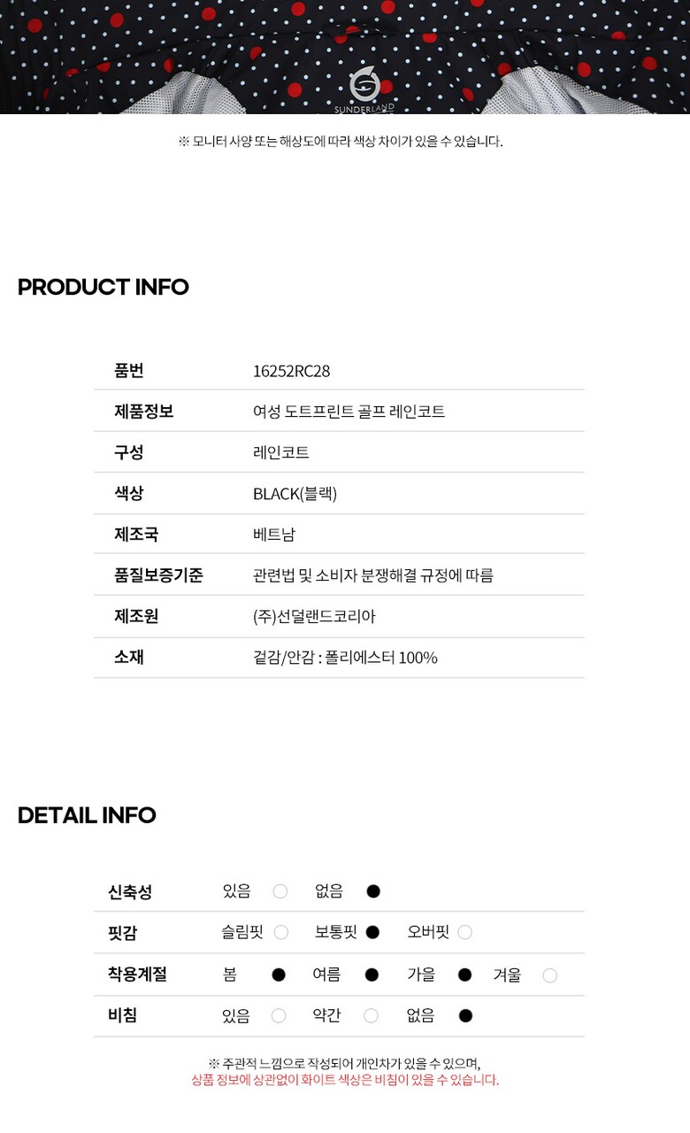 선덜랜드 여성 도트프린트 골프 레인코트/비옷 - 16252RC28