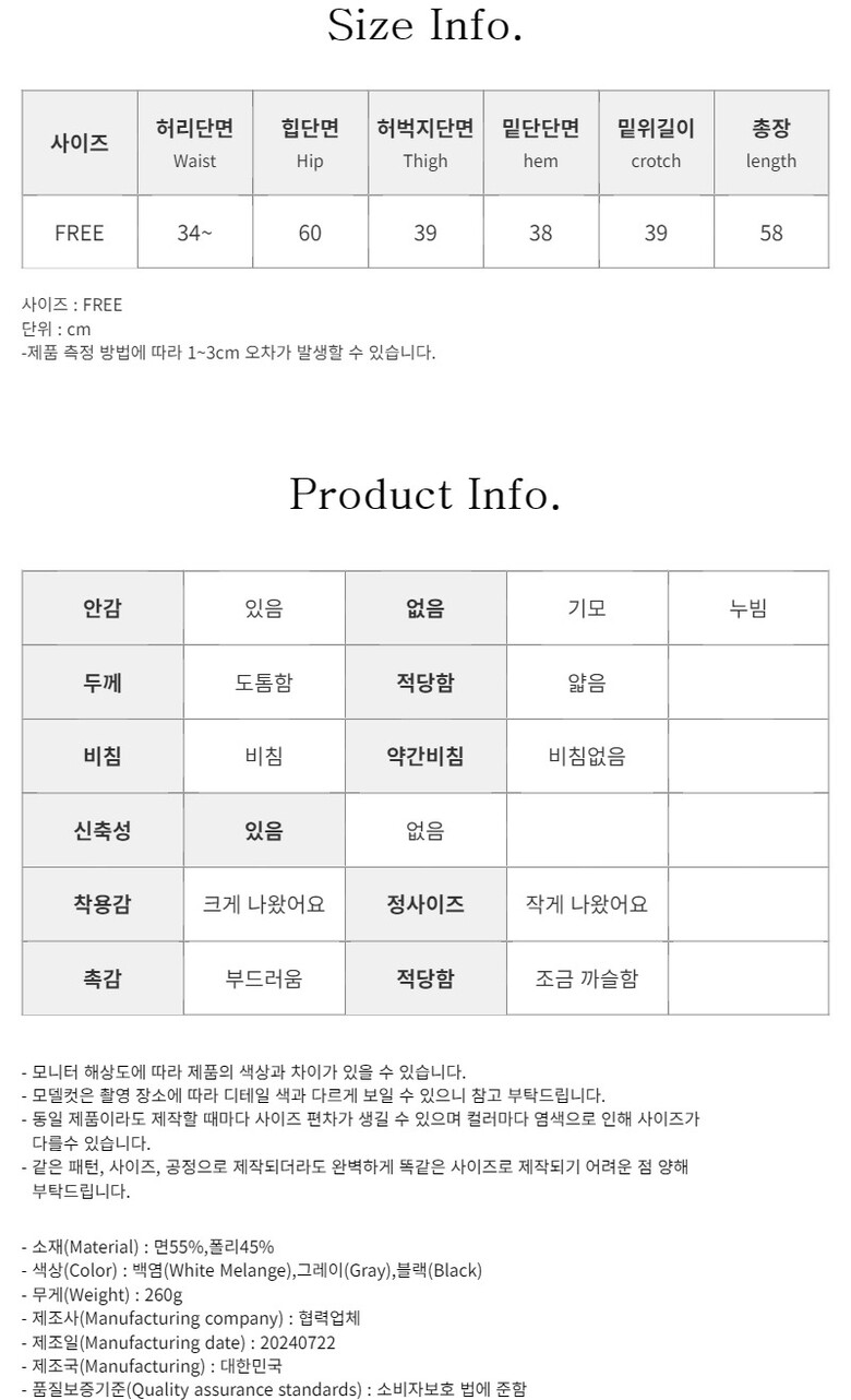 - 안감(없음),촉감(적당함),착용감(정사이즈),신축성(있음),두께감(적당함),비침(약간비침),사이즈(44~66)