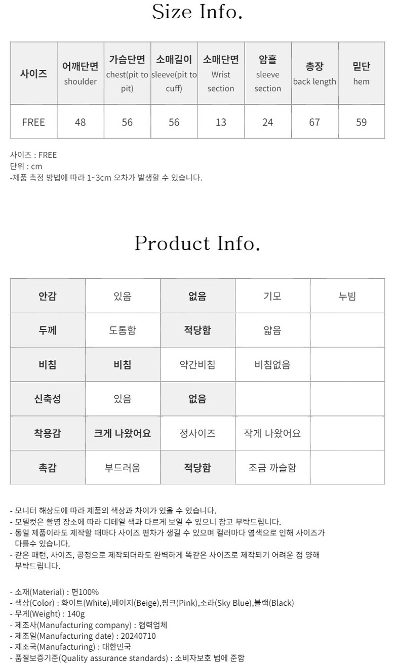 어깨단면 / 가슴단면 / 소매길이 / 소매단면 / 암홀 / 총장 / 밑단 (FREE)48 / 56 / 56 / 13 / 24 / 67 / 59