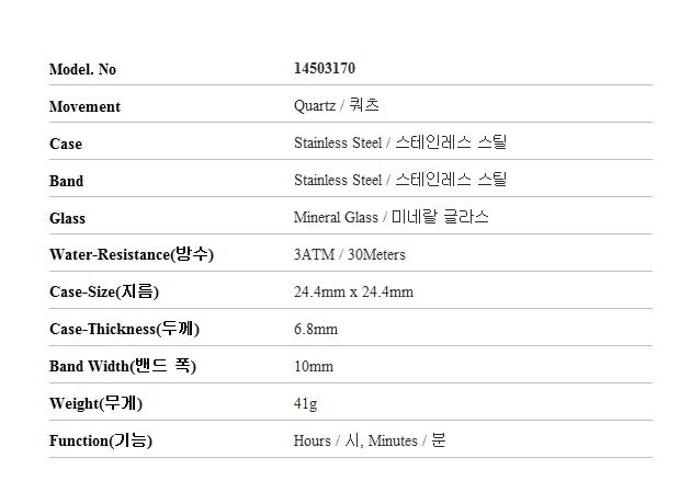 | 1. 소재 / 순도 / 밴드재질 | 실버/ 케이스 - 스테인리스스틸 / 밴드 - 스테인리스스틸 |
