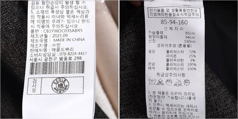 | 1. 제품 소재 (섬유의 조성 또는 혼용률을 백분율로 표시, 기능성인 경우 성적서 또는 허가서) | 겉감-폴리에스터72% 폴리우레탄3% 레이온25% 안감-폴리에스터100% 배색-폴리에스터100% |