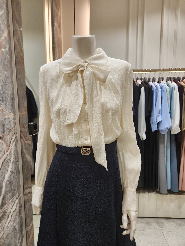 리본 타이 블라우스를 레이어드한 디자인으로 포인트를 주었습니다.