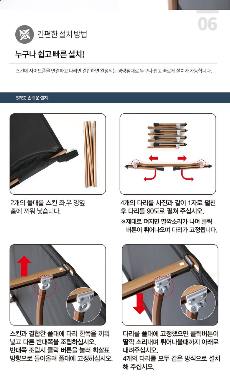5. 제품 구성 | 수납가방, 야전침대, 간이베개, 바닥 보호캡 |