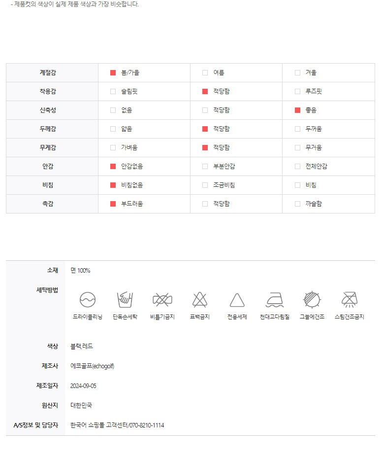1. 제품 소재 (섬유의 조성 또는 혼용률을 백분율로 표시, 기능성인 경우 성적서 또는 허가서) | 상품 이미지 참조 |