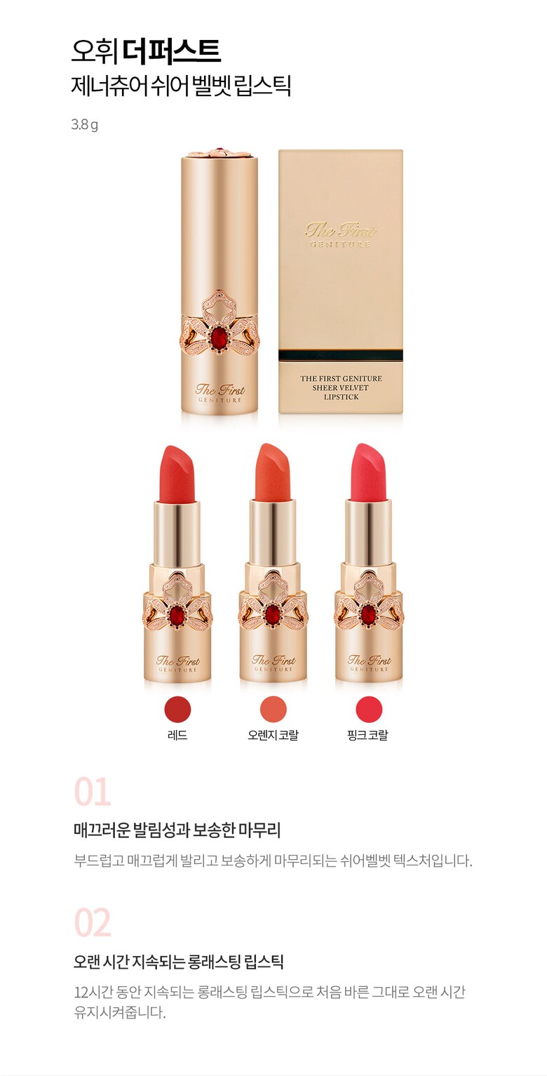 오휘 더 퍼스트 제너츄어 쉬어 벨벳 립스틱 (핑크코랄) /보송 고발색 24H 롱래스팅