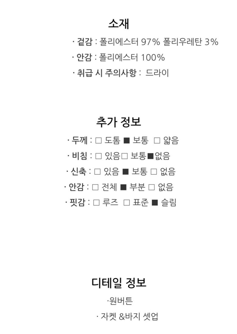| 1. 제품 소재 (섬유의 조성 또는 혼용률을 백분율로 표시, 기능성인 경우 성적서 또는 허가서) | 상품상세참조 |