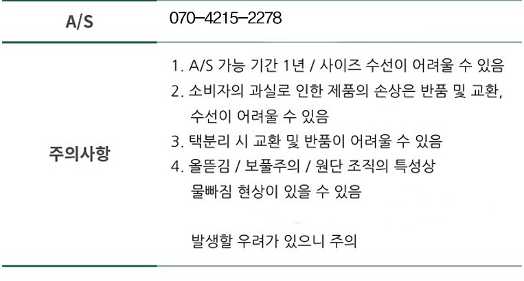 • 처음 배송된 상품상태와 다를 경우(세탁/착용 후 외출하신 경우) 반품이 불가합니다.