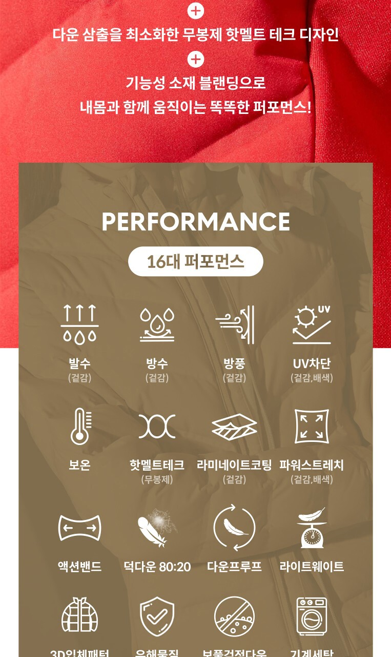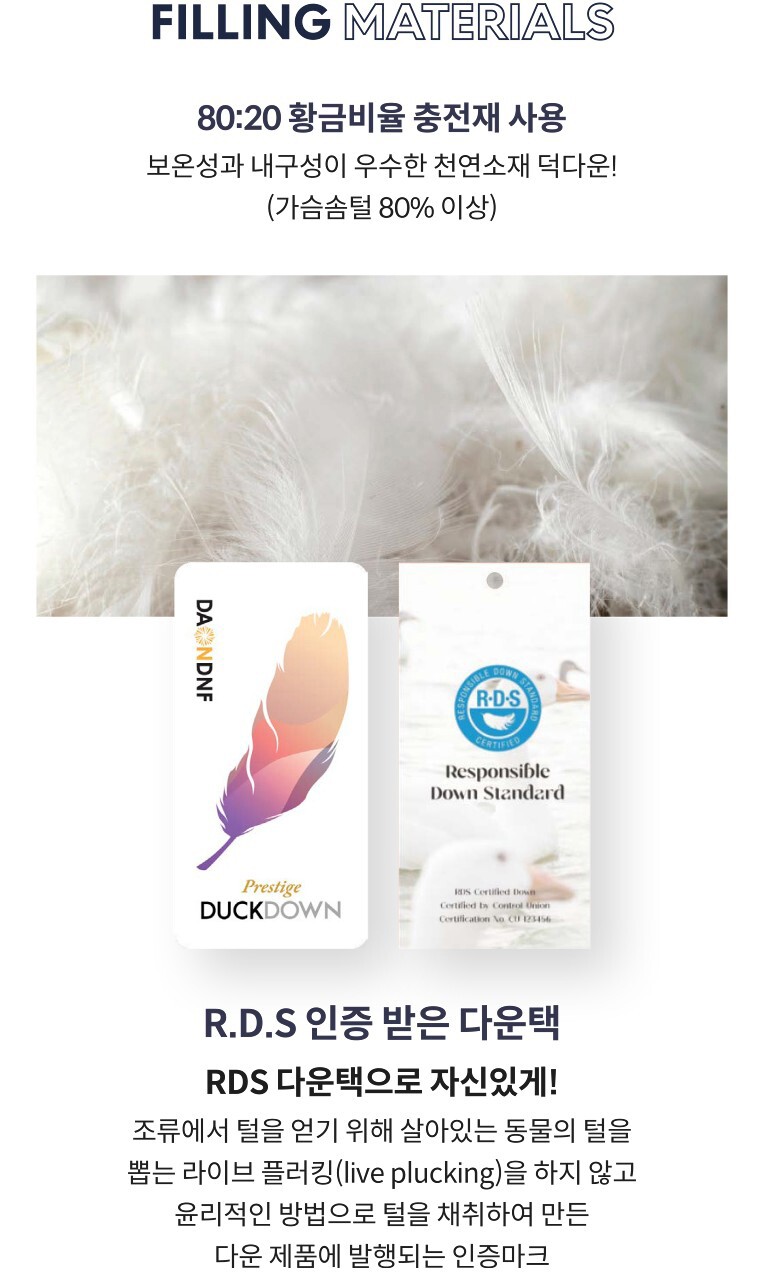 1. 제품 소재 (섬유의 조성 또는 혼용률을 백분율로 표시, 기능성인 경우 성적서 또는 허가서) 덕다운 솜털80 깃털20