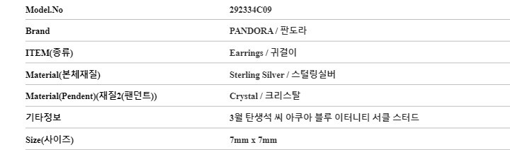 | 1. 소재 / 순도 / 밴드재질 | 실버 / 쥬얼리 - 스털링실버 / 팬던트 - 크리스탈 |