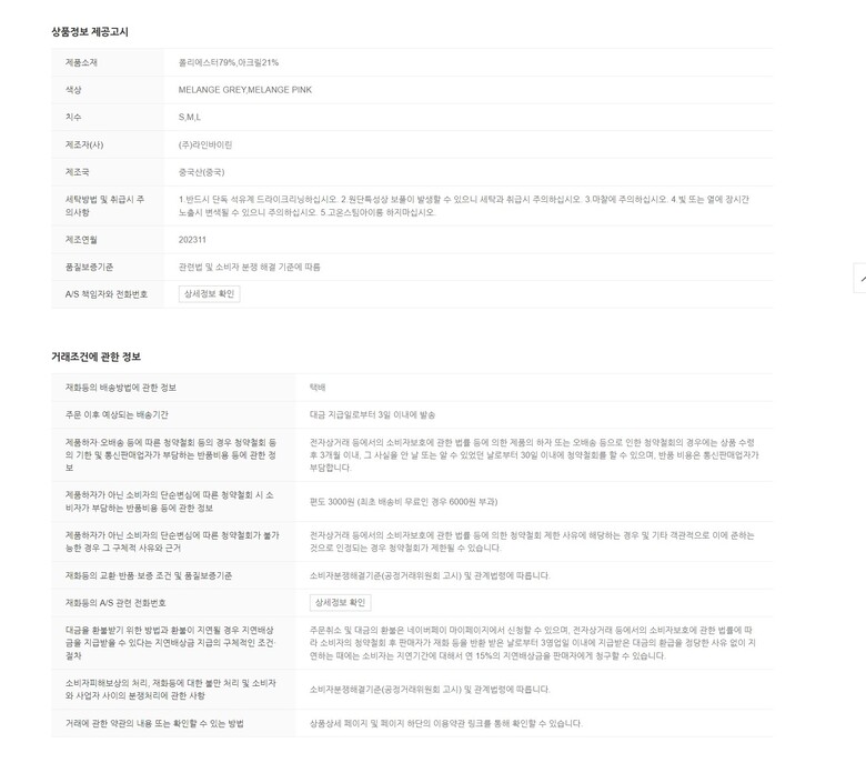 | 6. 세탁방법 및 취급시 주의사항 | 상품상세참조 |