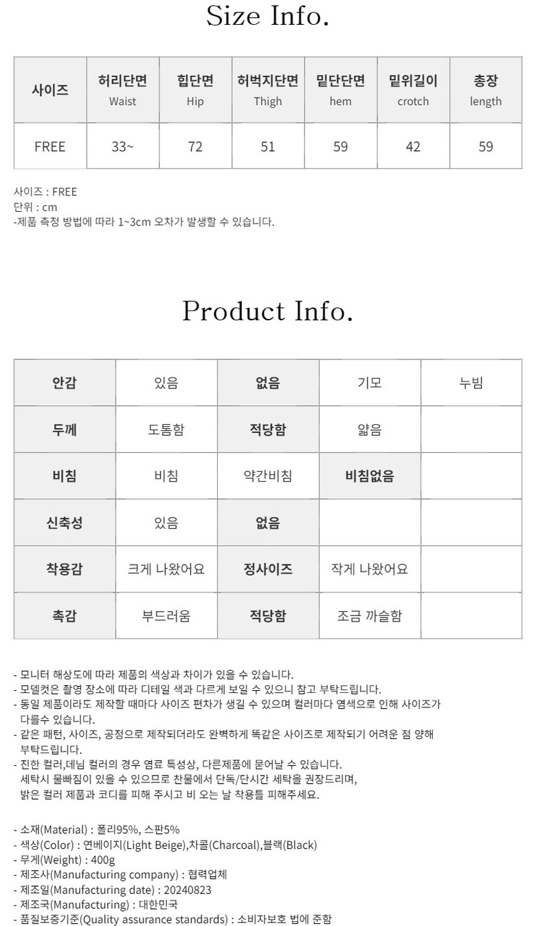 - 안감(없음),촉감(적당함),착용감(정사이즈),신축성(없음),두께감(적당함),비침(없음),사이즈(44~66)