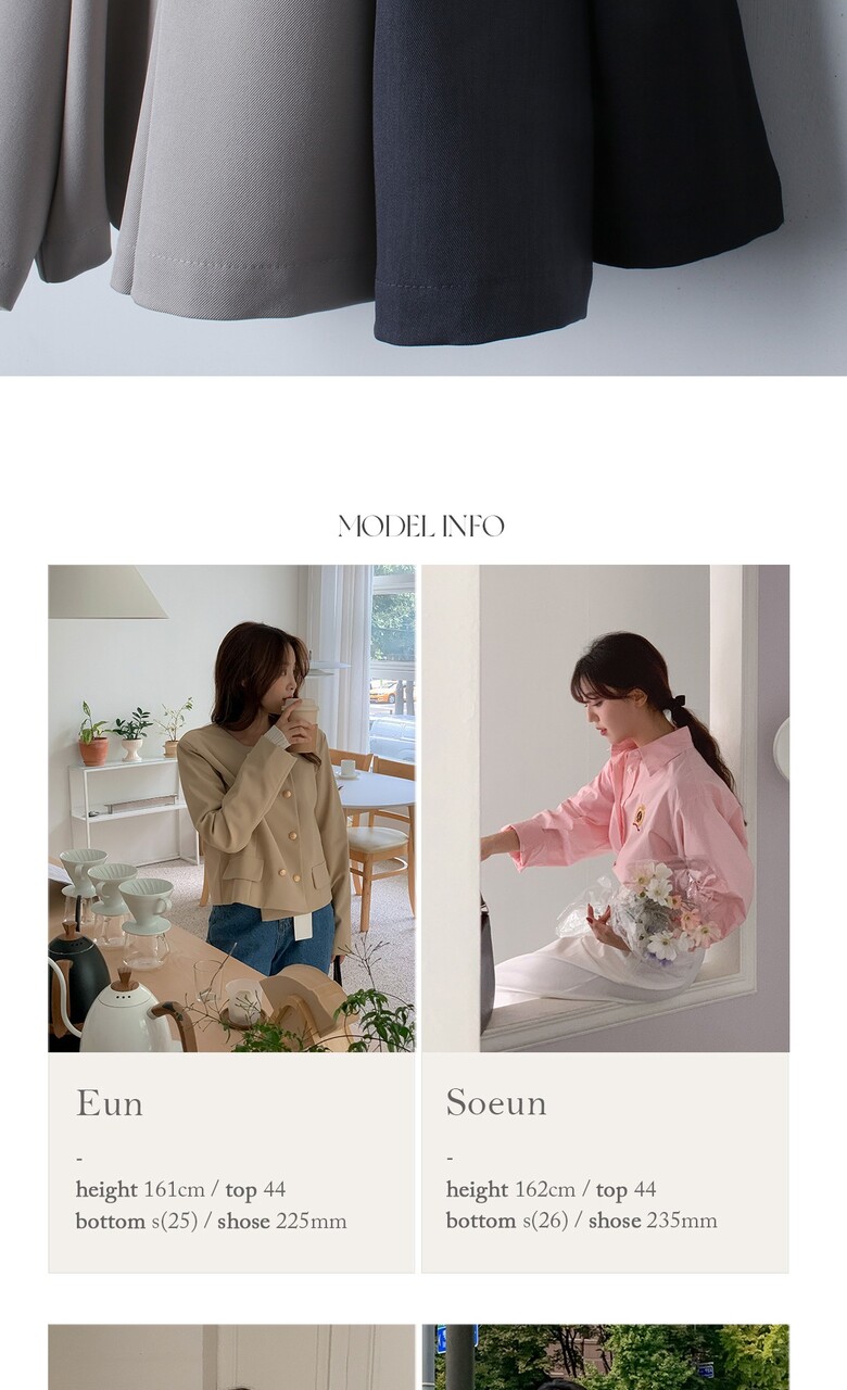 Top 44 / Bust 70A / Pants 26 / Height 162cm / Shoes 235 size