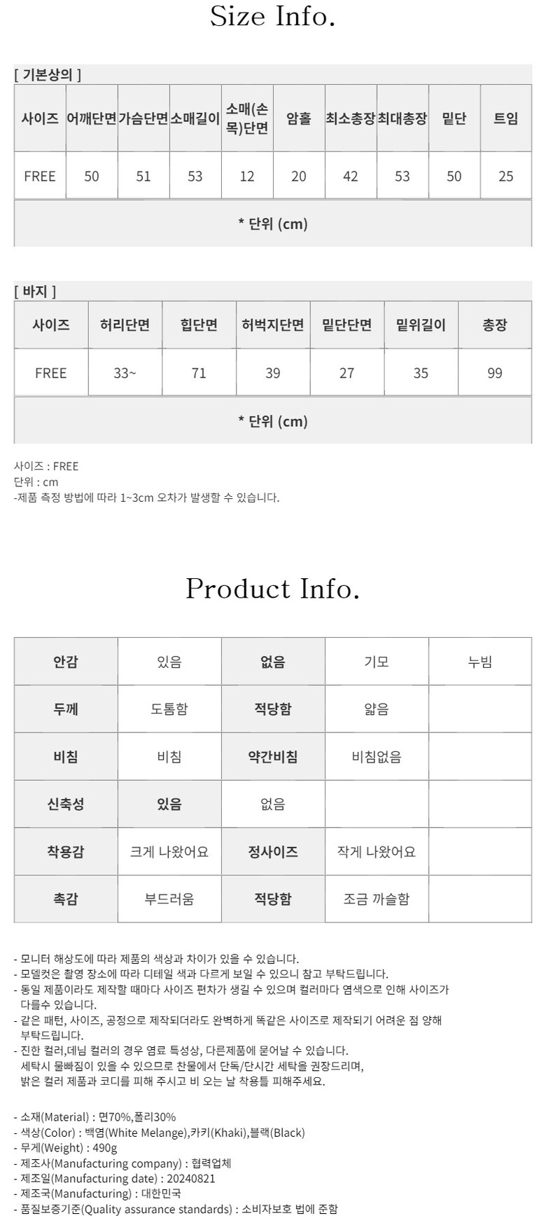 [ 기본상의 ] 어깨단면 / 가슴단면 / 소매길이 / 소매(손목)단면 / 암홀 / 최소총장 / 최대총장 / 밑단 / 트임 (FREE)50 / 51 / 53 / 12 / 20 / 42 / 53 / 50 / 25 [ 바지 ] 허리단면 / 힙단면 / 허벅지단면 / 밑단단면 / 밑위길이 / 총장 (FREE)33~ / 71 / 39 / 27 / 35 / 99
