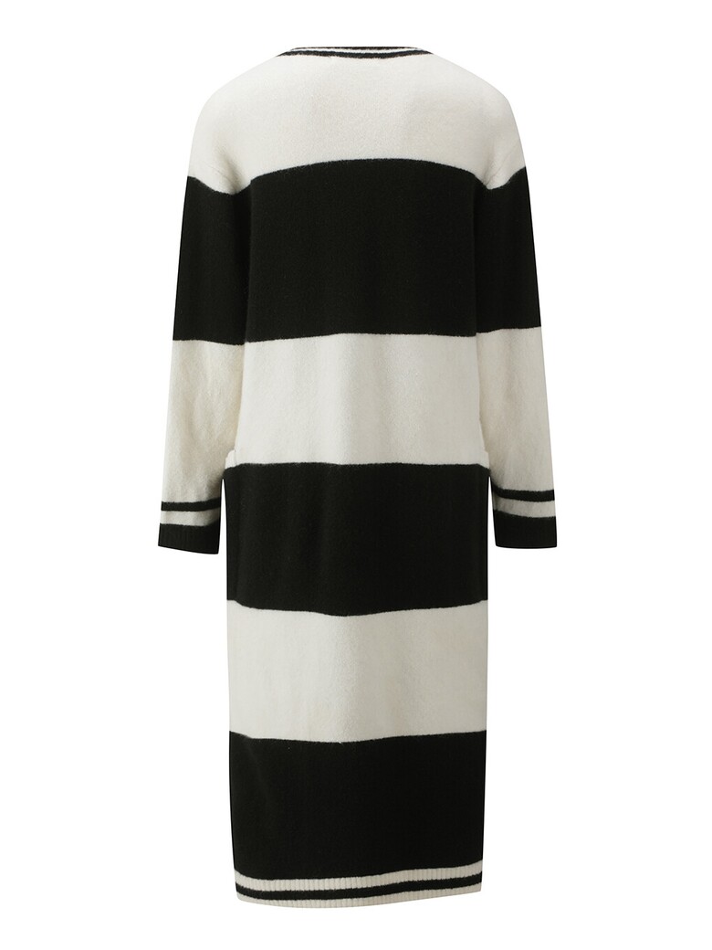 - 깊은 브이 네크라인에 넓은 스트라이프 패턴이 매력적인 맥시 기장의 가디건입니다.