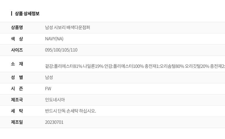 | 1. 제품 소재 (섬유의 조성 또는 혼용률을 백분율로 표시, 기능성인 경우 성적서 또는 허가서) | 겉감:폴리에스터81% 나일론19% 안감:폴리에스터100% 충전재1:오리솜털80% 오리깃털20% 충전재2:폴리에스터100% 배색:폴리에스터90%폴리우레탄10% |