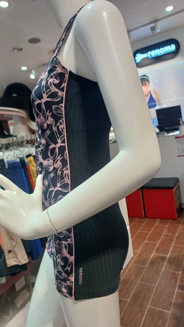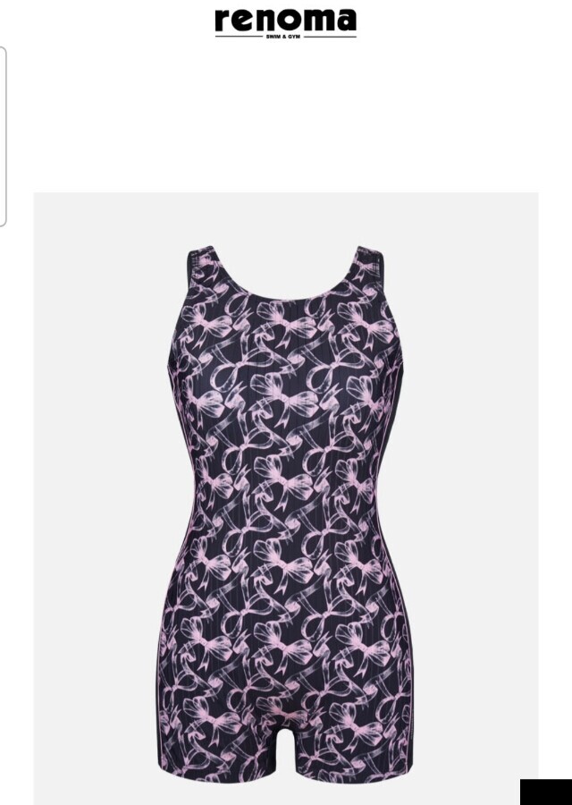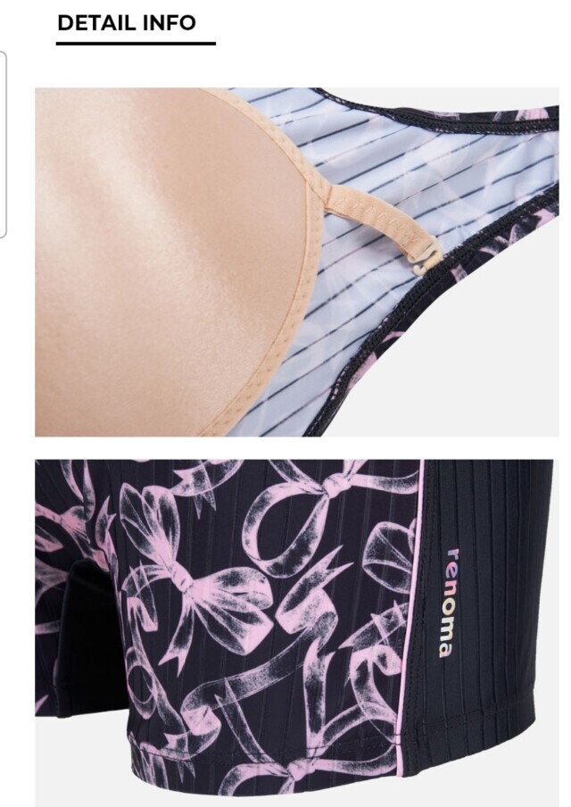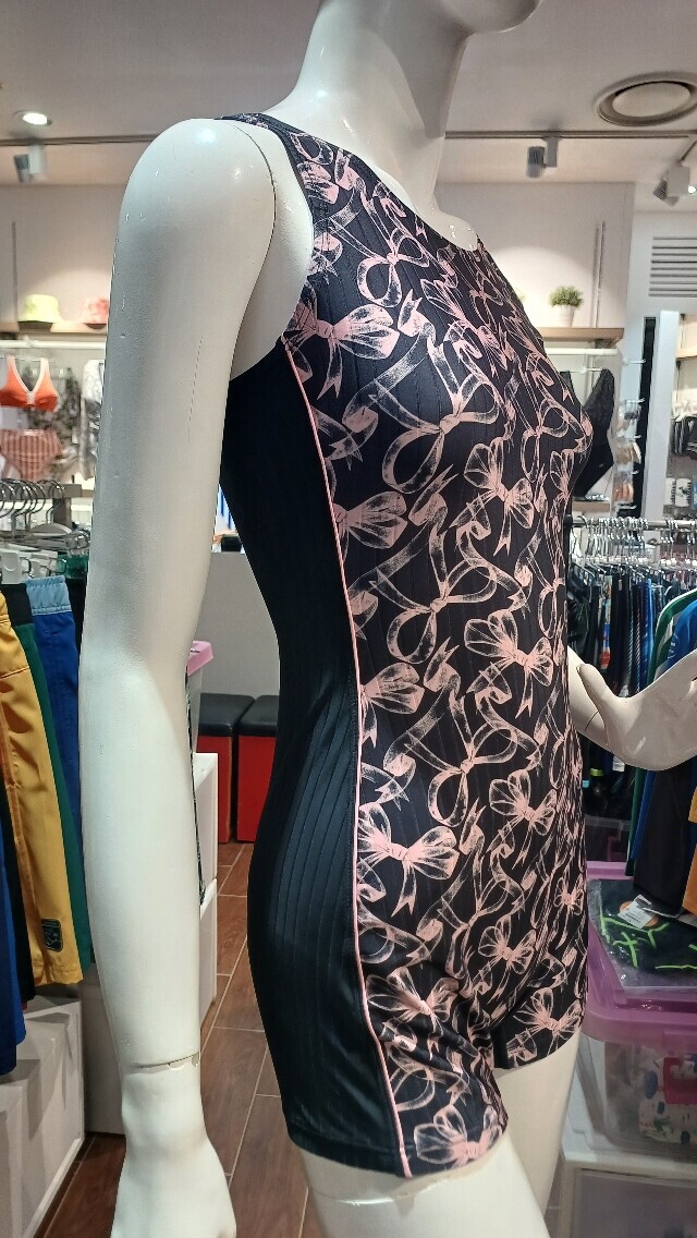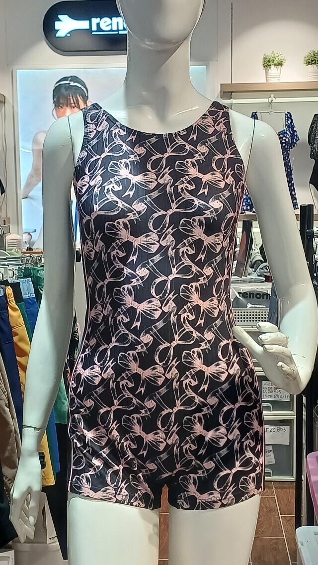 여성스러운 핑크리본 무늬가 체형커버에 도움 되며 브라 고리가 적용되어 용도에 따라 탈부착해서 사용하는 2부 반신 실내수영복입니다.