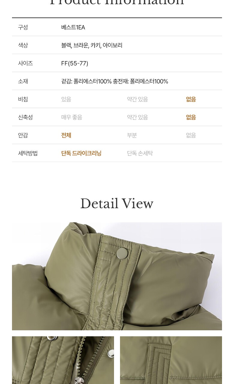 1. 제품 소재 (섬유의 조성 또는 혼용률을 백분율로 표시, 기능성인 경우 성적서 또는 허가서) 겉감: 폴리에스터100%