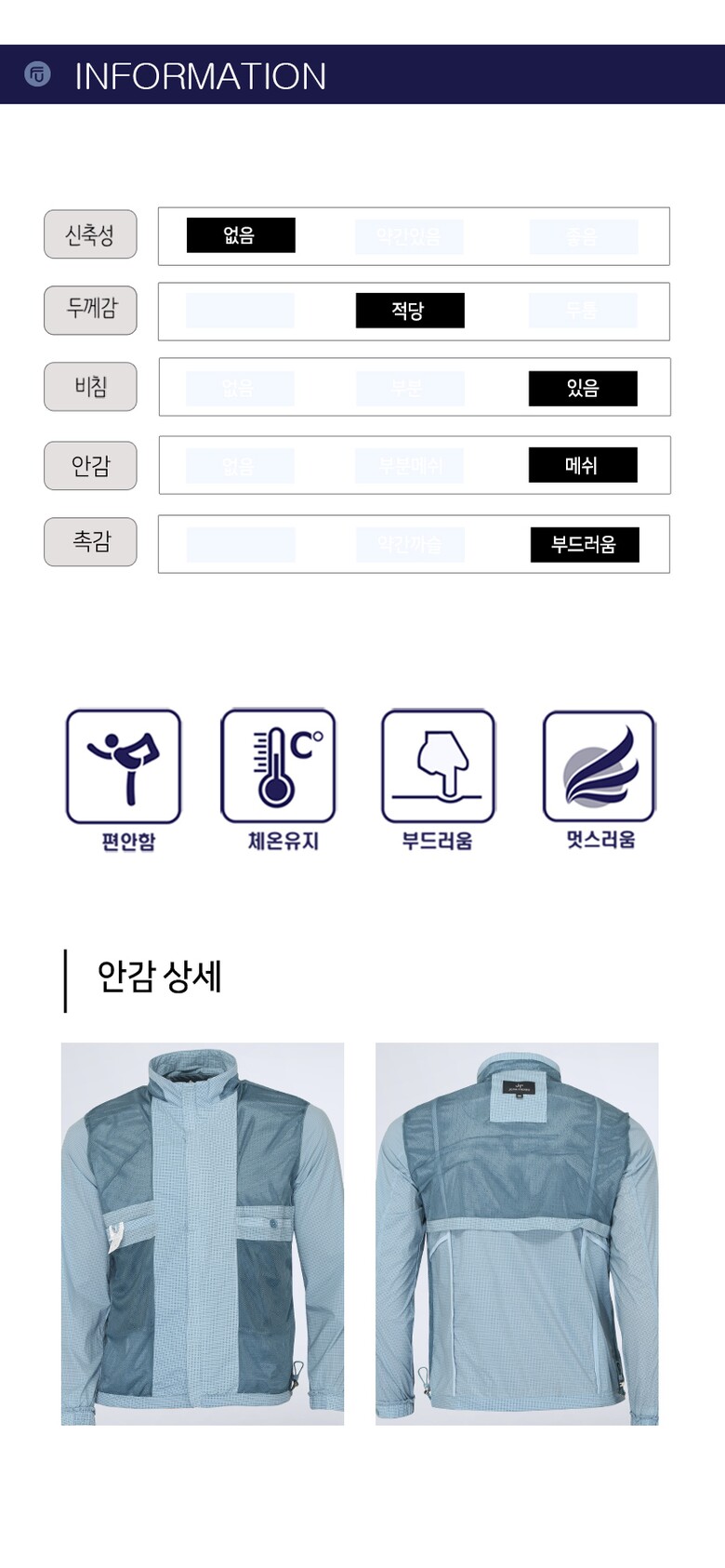 | 1. 제품 소재 (섬유의 조성 또는 혼용률을 백분율로 표시, 기능성인 경우 성적서 또는 허가서) | 상세설명참고 |