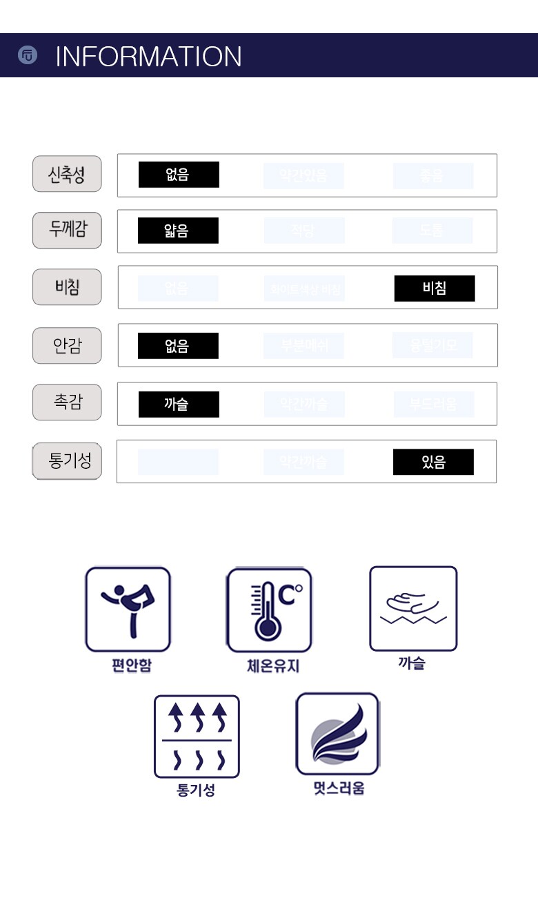 | 1. 제품 소재 (섬유의 조성 또는 혼용률을 백분율로 표시, 기능성인 경우 성적서 또는 허가서) | 상세설명참고 |