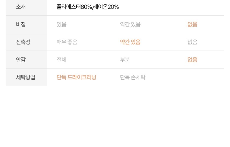 1. 제품 소재 (섬유의 조성 또는 혼용률을 백분율로 표시, 기능성인 경우 성적서 또는 허가서) | 폴리에스터80%,레이온20% |