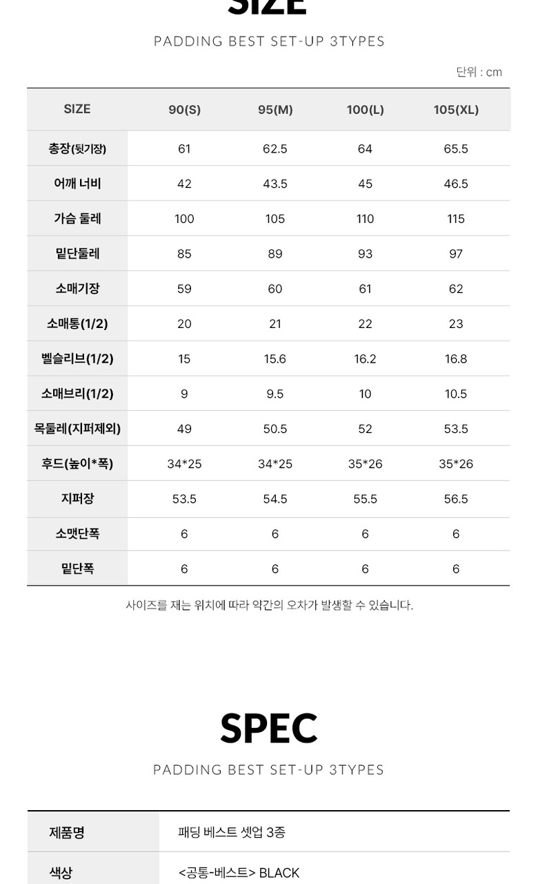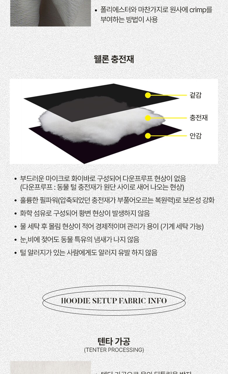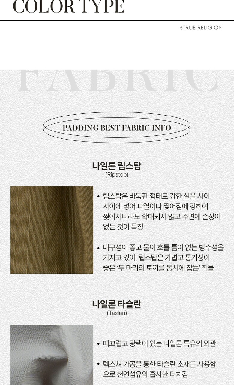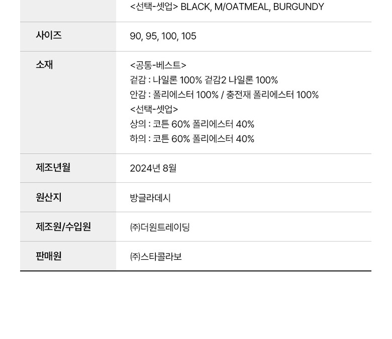 1. 제품 소재 (섬유의 조성 또는 혼용률을 백분율로 표시, 기능성인 경우 성적서 또는 허가서) | 베스트 : 나일론 100% 충전재 : 폴리에스터100% 셋업 : 코튼60% 폴리에스터 40% |