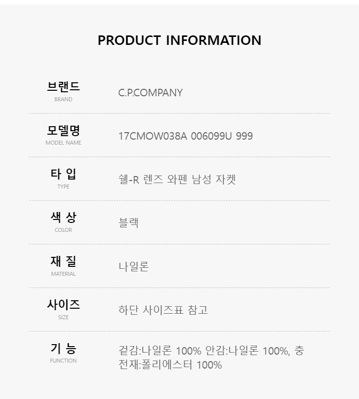 CP컴퍼니 17CMOW038A 006099U 999 쉘-R 렌즈 와펜 남성 자켓