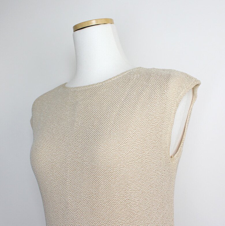 샤넬 베이지 니트 슬리브리스 원피스를 선보입니다.