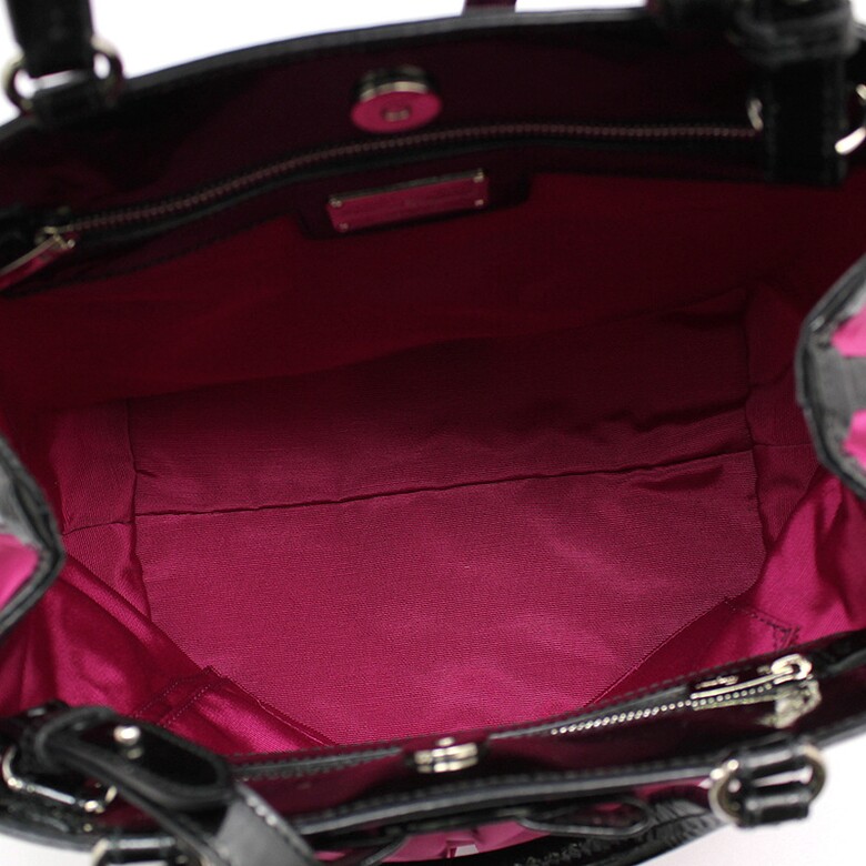 - 감각적인 핫핑크 패브릭 소재에 아이코닉한 블랙 바라 리본 장식이 더해진 아이템입니다.
