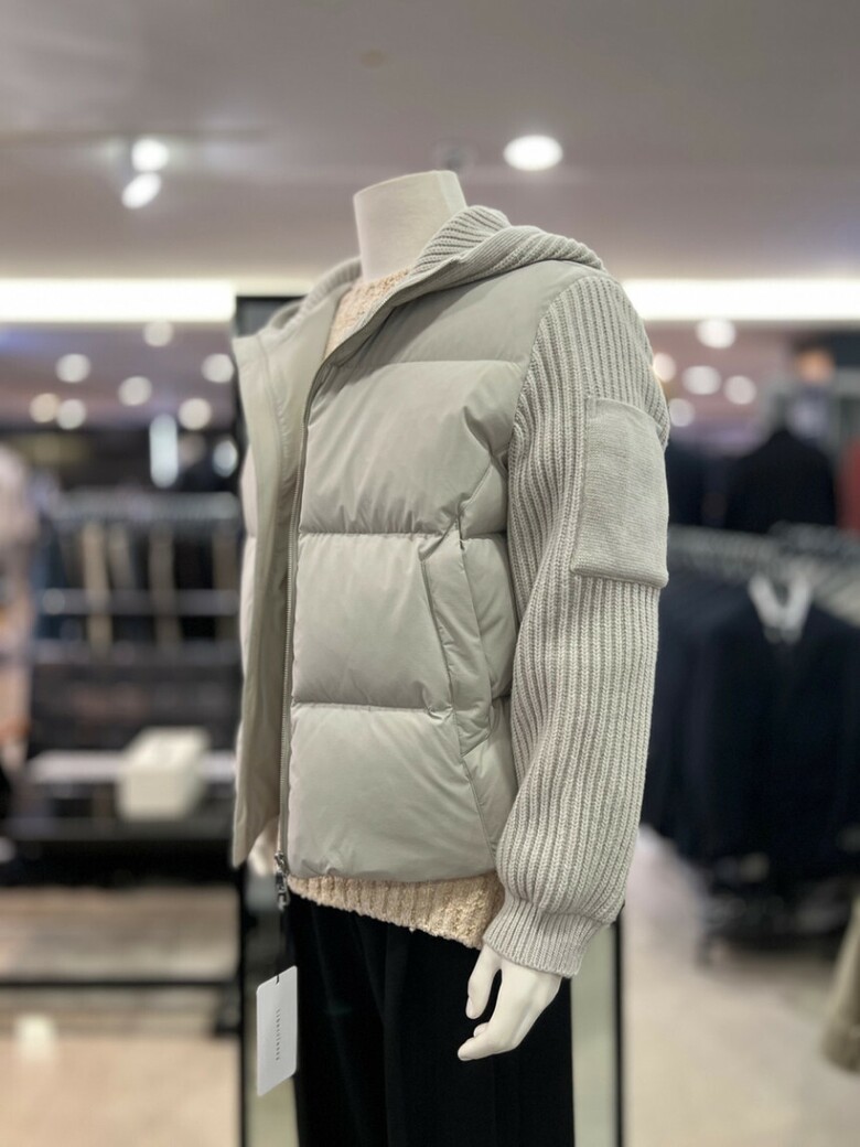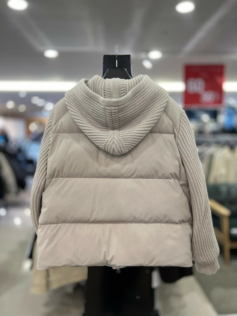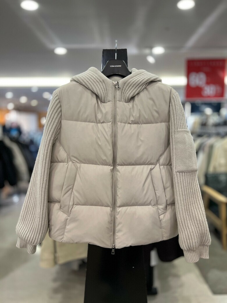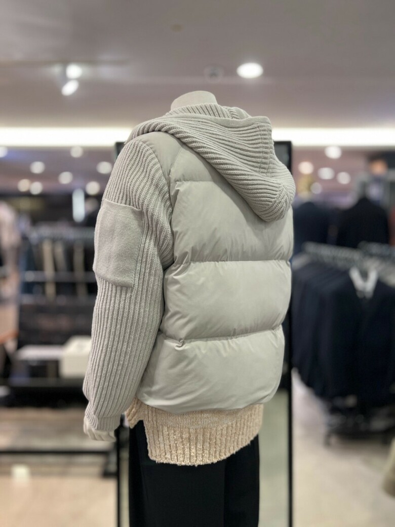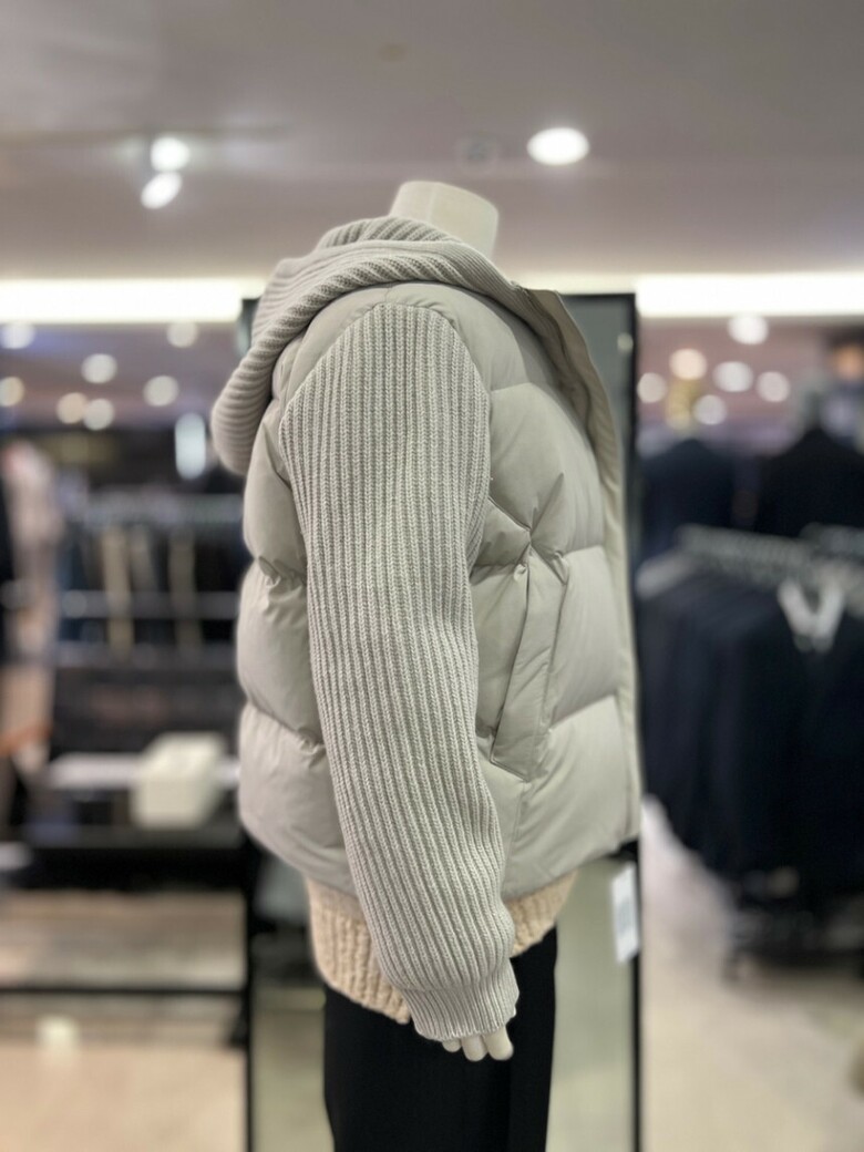 베이지 니트배색 구스다운 후드점퍼