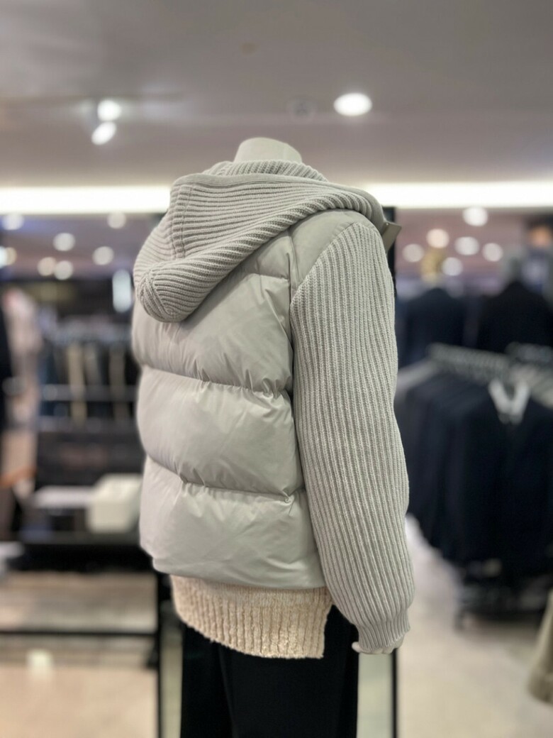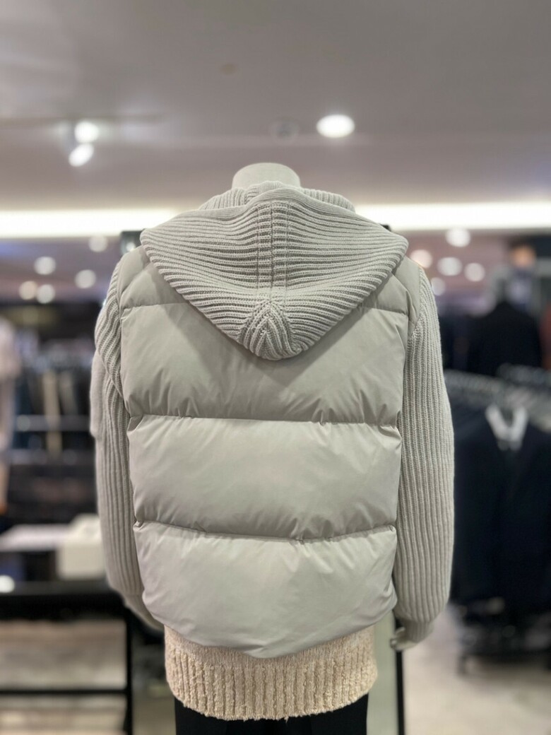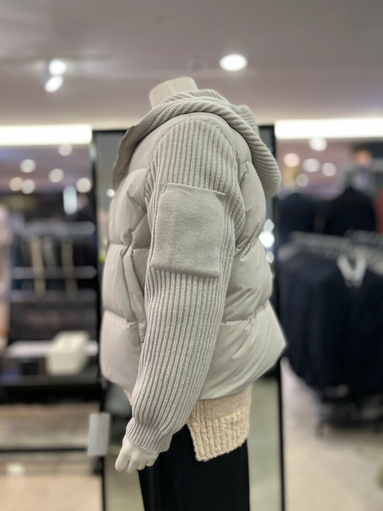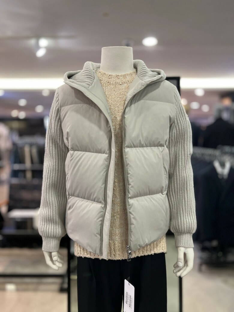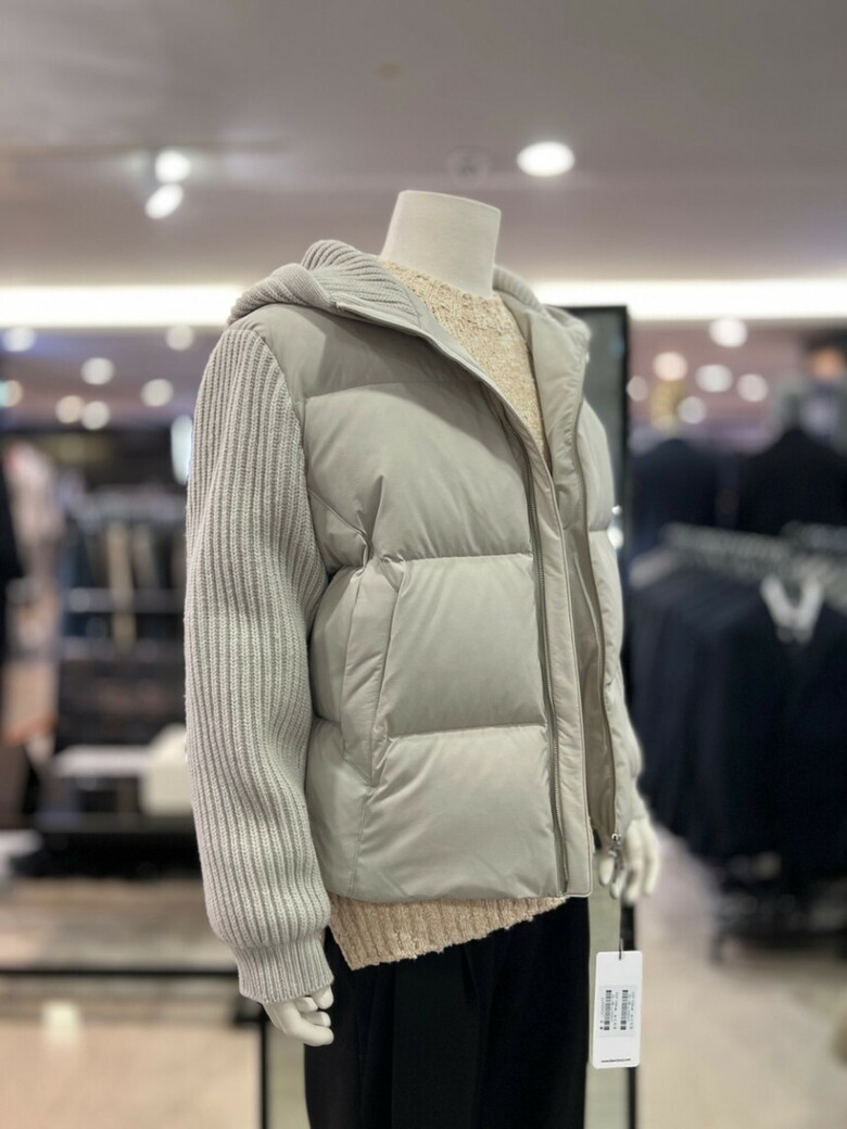 베이지 니트배색 구스다운 후드점퍼