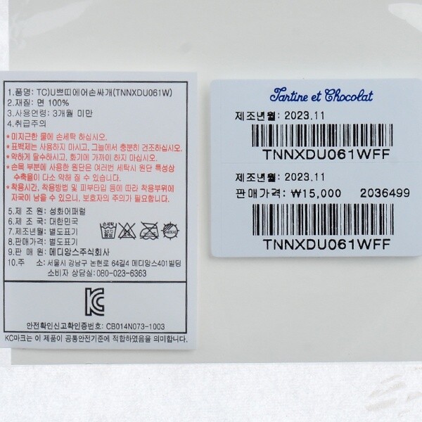 | 1. 제품 소재 (섬유의 조성 또는 혼용률을 백분율로 표시, 기능성인 경우 성적서 또는 허가서) | 면 100% |