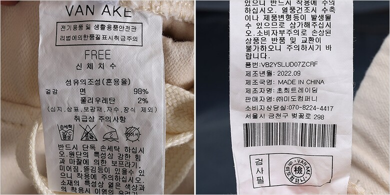 | 1. 제품 소재 (섬유의 조성 또는 혼용률을 백분율로 표시, 기능성인 경우 성적서 또는 허가서) | 겉감-면98% 폴리우레탄2% |