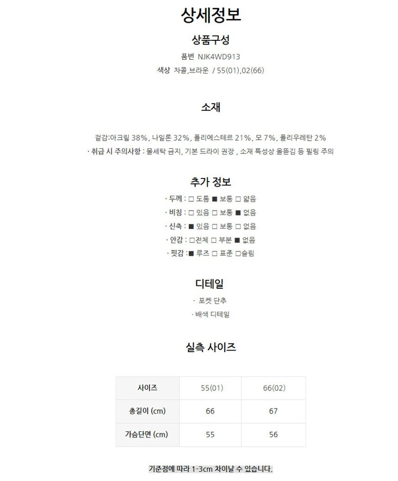 | 1. 제품 소재 (섬유의 조성 또는 혼용률을 백분율로 표시, 기능성인 경우 성적서 또는 허가서) | 겉감:아크릴 38%, 나일론 32%, 폴리에스테르 21%, 모 7%, 폴리우레탄 |