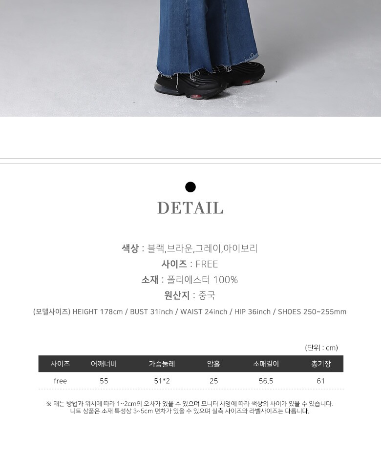 • 처음 배송된 상품상태와 다를 경우(세탁/착용 후 외출하신 경우) 반품이 불가합니다.