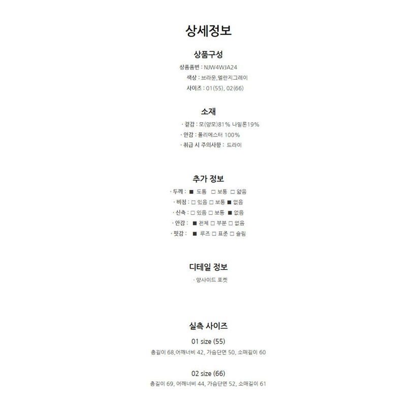 | 1. 제품 소재 (섬유의 조성 또는 혼용률을 백분율로 표시, 기능성인 경우 성적서 또는 허가서) | 모 81%, 나일론 19% / 안감:폴리에스테르 100% |