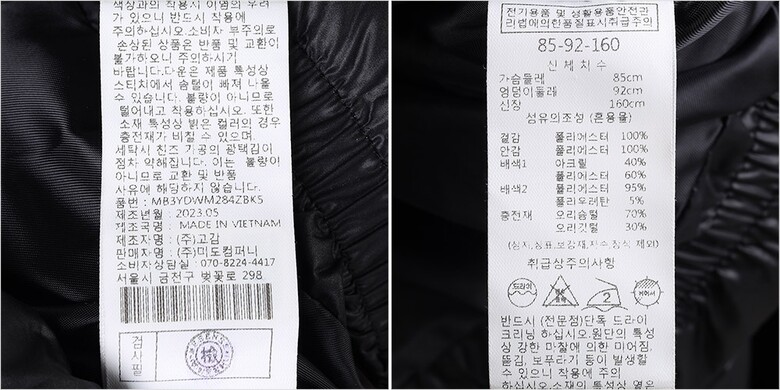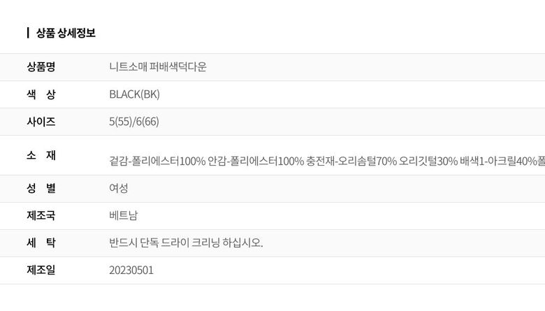 | 1. 제품 소재 (섬유의 조성 또는 혼용률을 백분율로 표시, 기능성인 경우 성적서 또는 허가서) | 겉감-폴리에스터100% 안감-폴리에스터100% 충전재-오리솜털70% 오리깃털30% 배색1-아크릴40%폴리에스터60% 배색2-폴리에스터95%폴리우레탄5% |