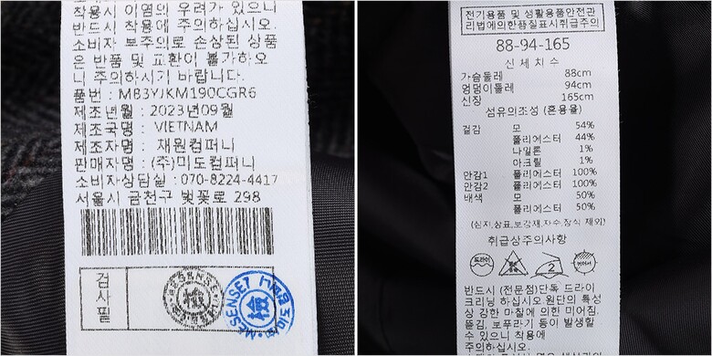 | 1. 제품 소재 (섬유의 조성 또는 혼용률을 백분율로 표시, 기능성인 경우 성적서 또는 허가서) | 겉감-폴리에스터44% 나일론1% 아크릴1% 모54% 안감1-폴리에스터100% 안감2-폴리에스터100% 배색-모50%폴리에스터50% |