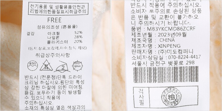 1. 제품 소재 (섬유의 조성 또는 혼용률을 백분율로 표시, 기능성인 경우 성적서 또는 허가서) 겉감-폴리에스터20% 나일론28% 아크릴52%