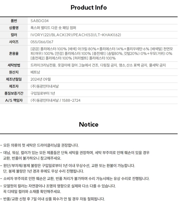 • 처음 배송된 상품상태와 다를 경우(세탁/착용 후 외출하신 경우) 반품이 불가합니다.