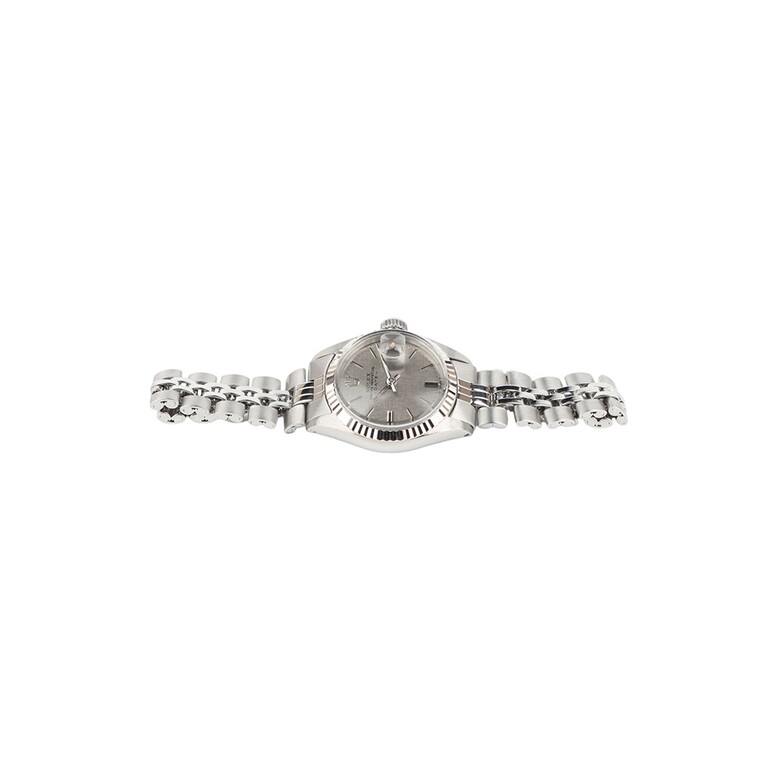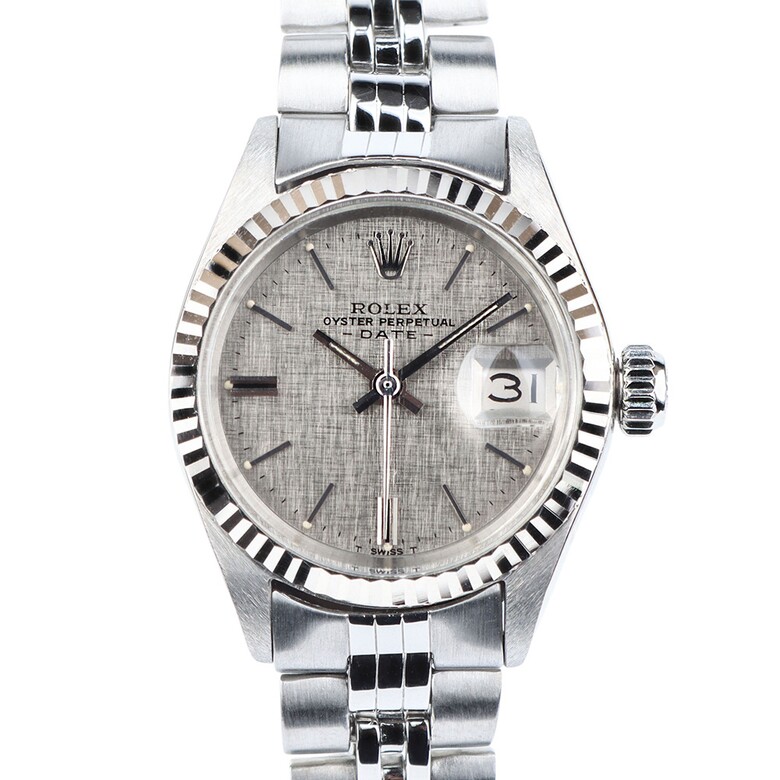 깔끔하고 심플한 다이얼이 특징인 롤렉스 오이스터 퍼페츄얼 데이트 여성용 시계입니다.