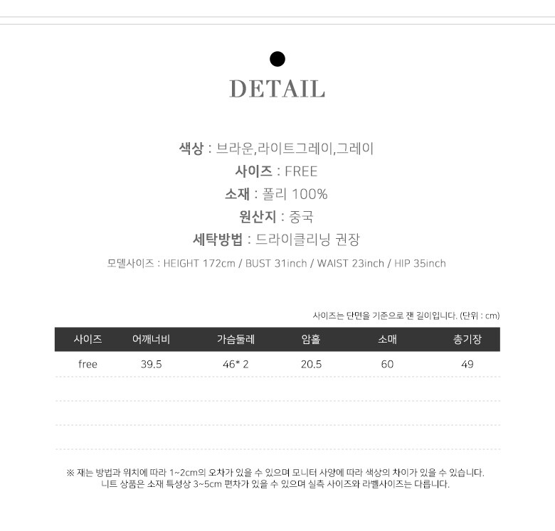 | 3. 치수 | 어깨 39.5 가슴 46*2 암홀 20.5 소매 60 총장 49 |