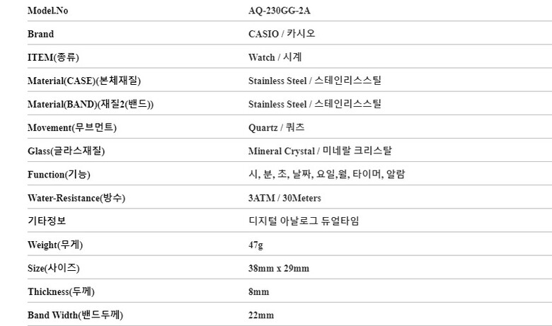 카시오 AQ-230GG-2ADF (AQ-230GG-2A) 아날로그 디지털 스퀘어 빈티지 레트로 공용 메탈시계