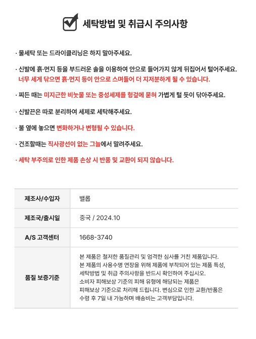 • 처음 배송된 상품상태와 다를 경우(세탁/착용 후 외출하신 경우) 반품이 불가합니다.