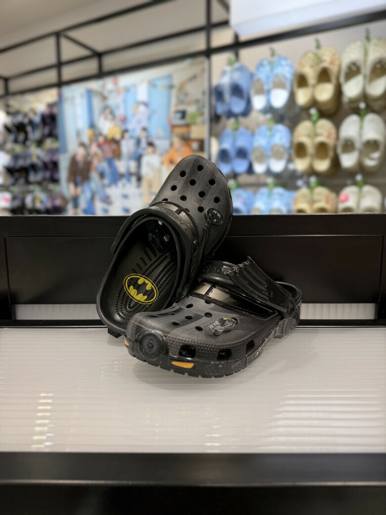 배트맨 배트모빌 클래식 클로그는 스트랩 옆면의 박쥐 날개까지 배트맨의 차에서 영감을 받은 디자인이며
