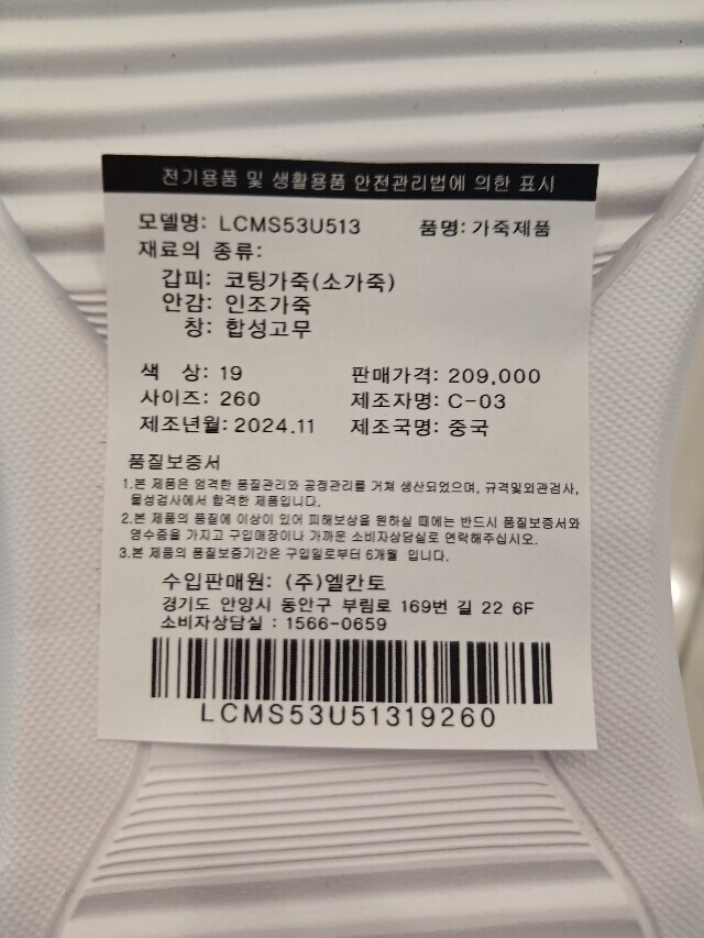 | 1. 제품 소재 (운동화인 경우에는 겉감, 안감을 구분하여 표시) | 상품상세참조 |