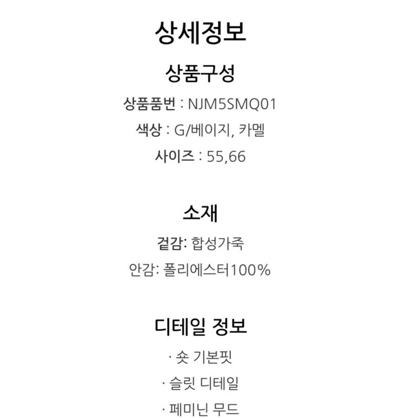 | 1. 제품 소재 (섬유의 조성 또는 혼용률을 백분율로 표시, 기능성인 경우 성적서 또는 허가서) | 상품상세참조 |