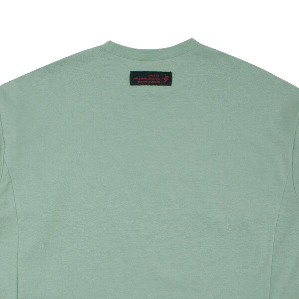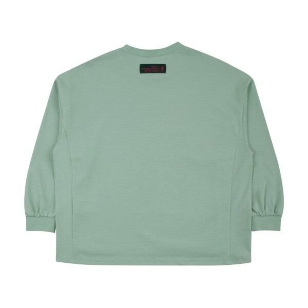 힙 덮는 기장감에 상동이 넓은 스타일의 민트 긴팔 티셔츠입니다. 옆선이 앞으로 넘어왔으며 앞 밑단이 살짝 짧습니다.