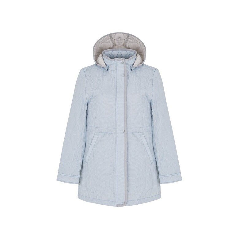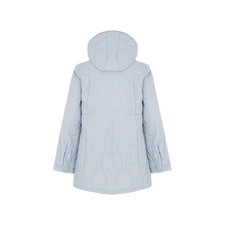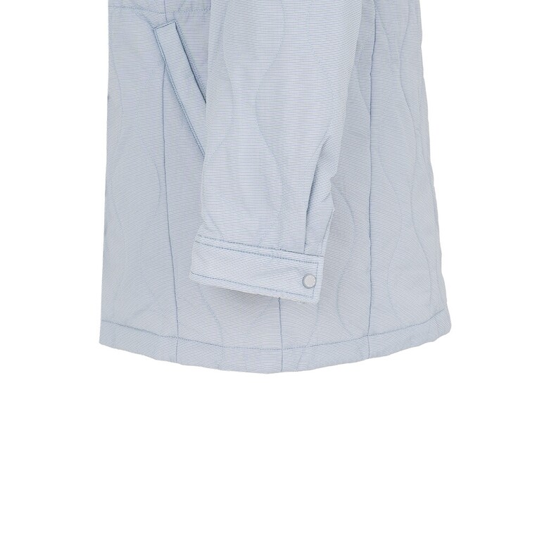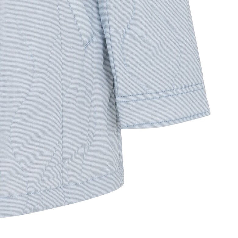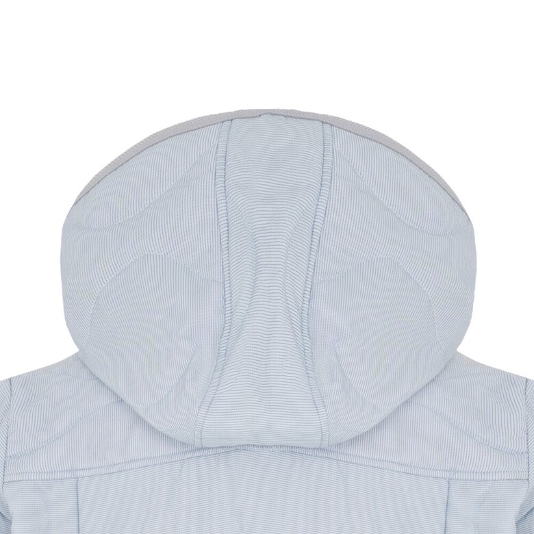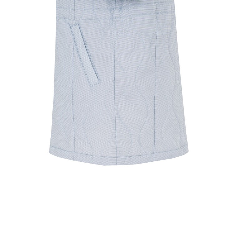 잔잔한 스트라이프 조직감의 소재로 힙을 덮는 기장감과 바인딩 디테일을 가미해 캐주얼한 느낌을 더한 아워글래스 퀼티드 패딩.